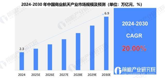 而在国内,随着政策不断开放,中国商业航天产业发展已驶入快车道。2025年至2030年,中国商业航天产业将进入发展黄金期,预计到2030年中国商业航天产业规模将有望达6.9万亿元人民币,年复合增长率约20%。